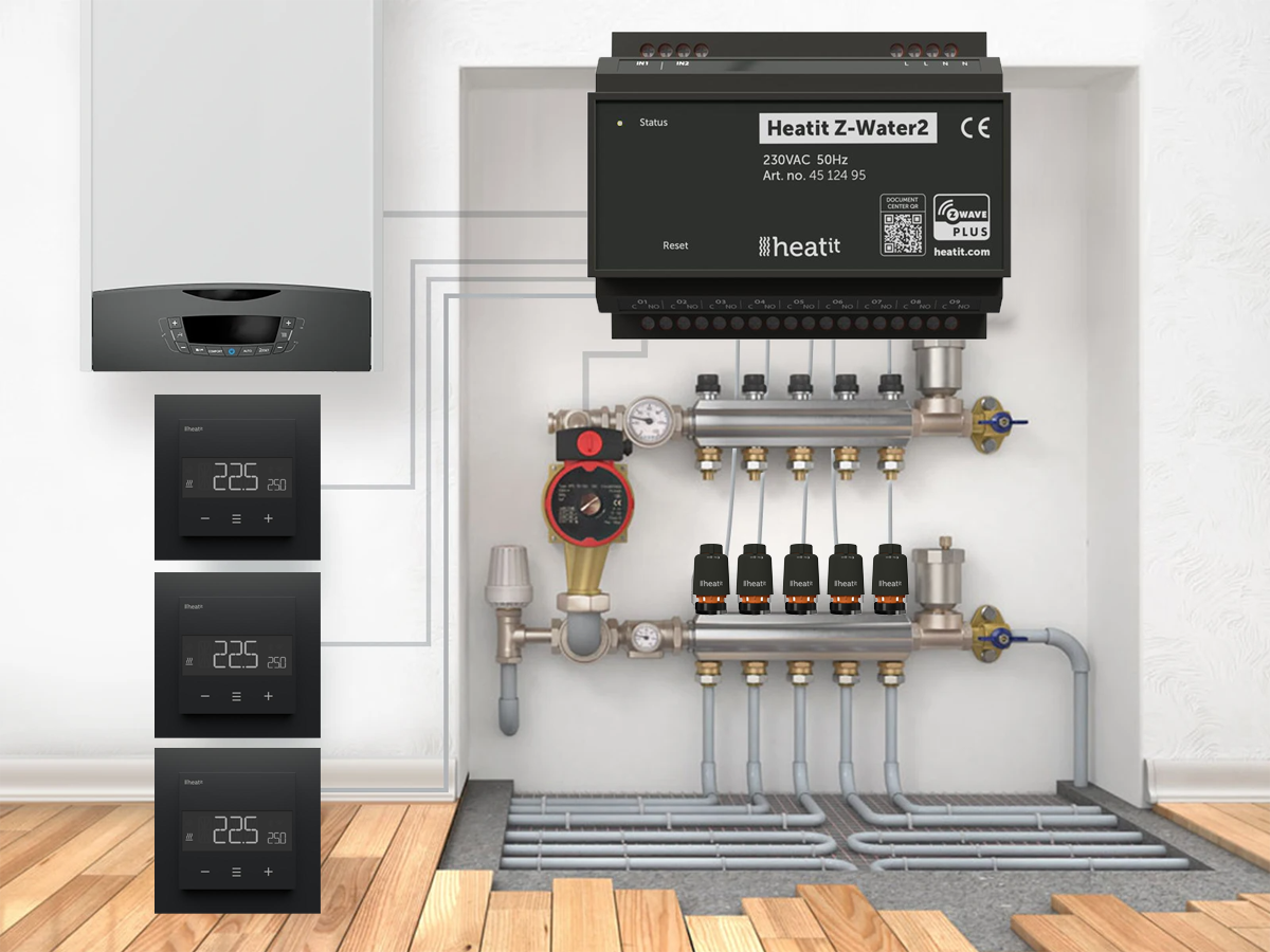 Це центральний вузол для водяних систем. Він керує до 9 контурів підлоги та термоелектричними приводами. Підтримує повну інтеграцію з хабами Z-Wave — Home Assistant, Fibaro, Aeotec, Homey.