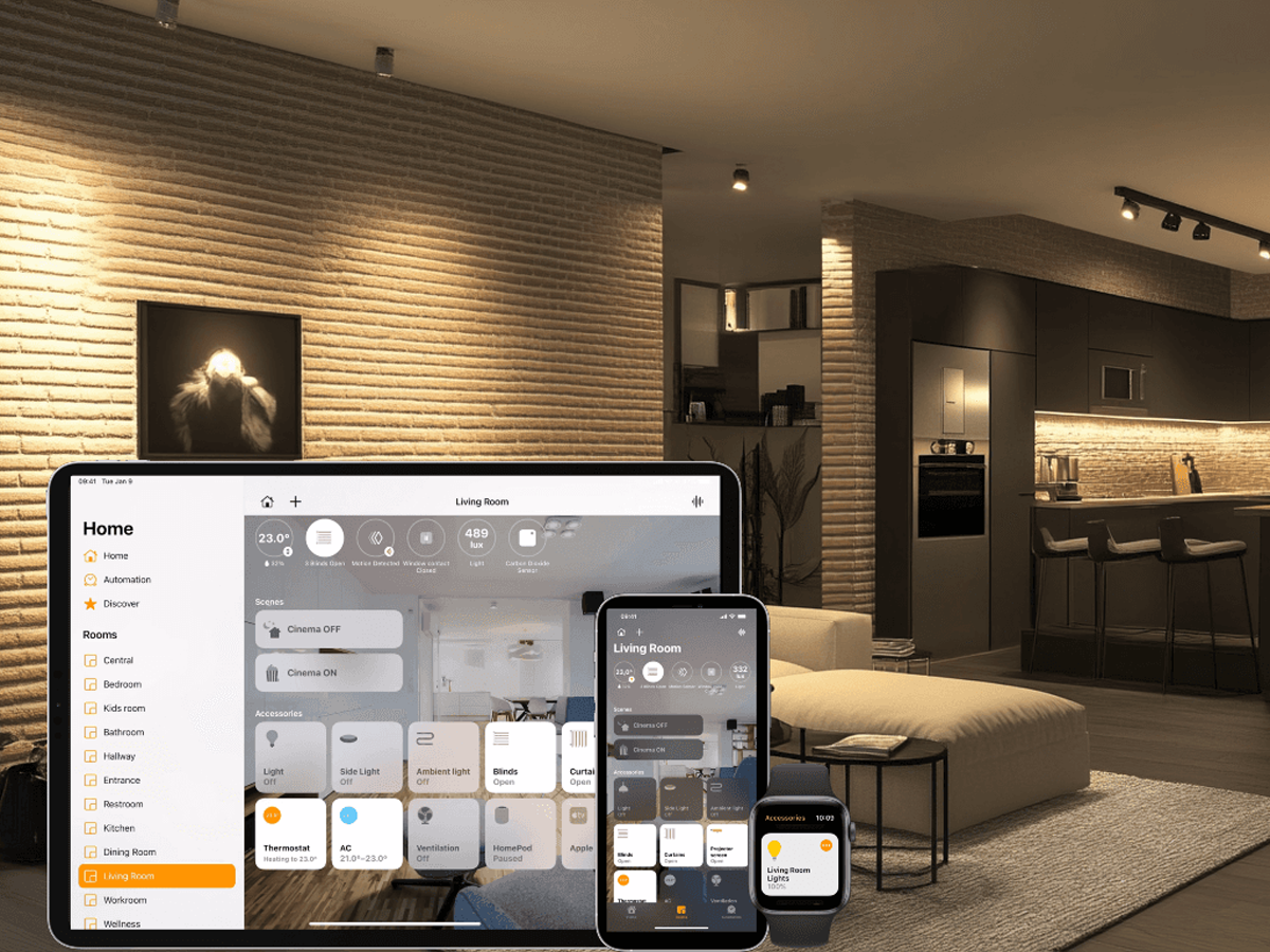 У більшості проєктів ми реалізуємо інсталяцію розумного будинку з підтримкою інтеграції в Apple HomeKit, голосового керування та мобільного додатку.